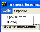 Меню состоит из пунктов «Файл» и «Справка». В пункте «Файл» есть подпункты «Пройти тест» (для перехода к тесту) и «Выход» (для завершения программы). В пункте «Справка» есть подпункты «О программе» (для вывода информации о программе) и «Об авторе» (для вывода информации об