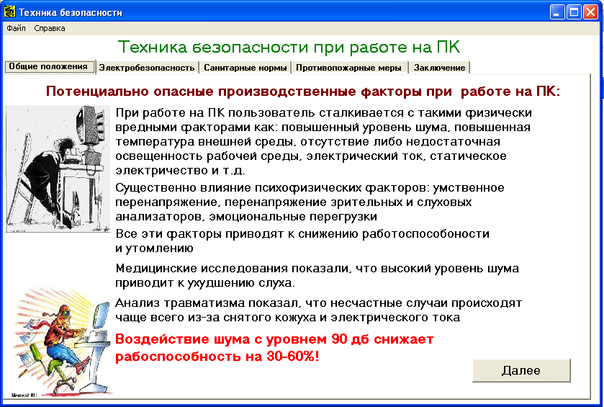В итоге была создана программа, позволяющая изучить технику безопасности при работе на ПК и пройти тестирование