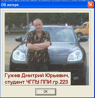 | 6 | Появление информации об авторе | При выборе пункта «Об авторе» (в меню главной формы в разделе «Справка») появляется информация об авторе программы | |