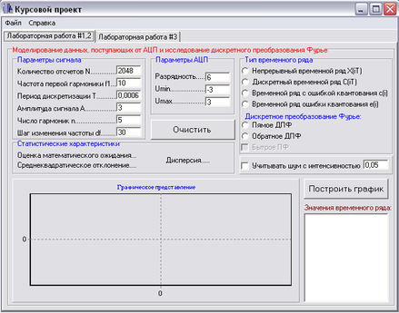 «Моделирование данных АЦП и исследование ДПФ» – это первая закладка, в которой при нажатии на соответствующую кнопку можно смоделировать исходный временной ряд, дискретный временной ряд, временной ряд с ошибкой квантования, временной ряд ошибки квантования и 4 вида ДПФ (прямое ДПФ, обратное ДПФ, быстрое прямое и быстрое обратное ДПФ). Для каждого из временных рядов будет построен соответствующий график и вычислены статистические характеристики: оценка математического ожидания, дисперсия, среднеквадратическое отклонение. При выборе кнопки «Прямое ДПФ» или «Обратное ДПФ» становится активной кнопка «Быстрое ПФ» и если на ней поставить галочку то будет произведено вычисление быстрого прямого или быстрого обратного ДПФ.
