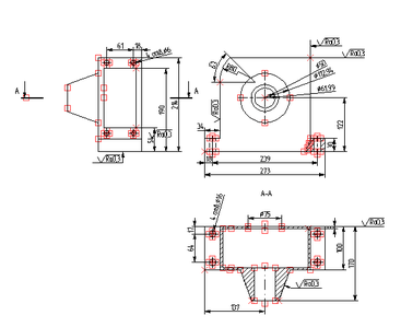 Выбранные виды появляются на поле чертежа. Далее необходимо проставить размеры (от трех баз) и шероховатости поверхностей, выполнить необходимый разрез. Результат показан на рис. 2.29.