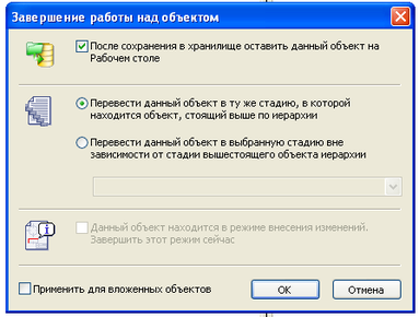 Для перевода объекта в стадию хранения необходимо в окне "Наименование объекта" щелкнуть правой кнопкой мыши по объекту "Деталь 731313" и выбрать "Сохранить в Хранилище". Появится окно "Завершение работы над объектом", в котором необходимо установить флажок в поле "После сохранения в хранилище оставить данный объект на Рабочем столе".