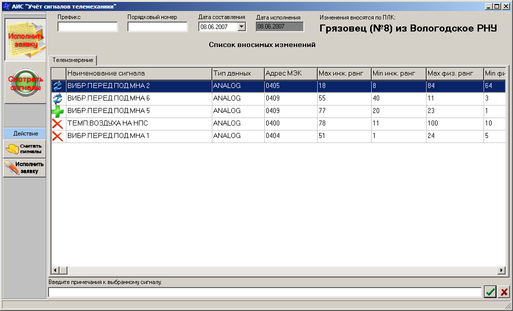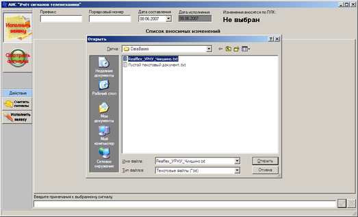 Пользователь нажимает кнопку «Считать сигналы» и выбирает текстовый файл с данными по сигналам, экспортированный из SCADA Realflex. Программа на основании данных из файла составляет список изменений, планируемых к внесению в базу данных проекта на основании вводимой заявки.