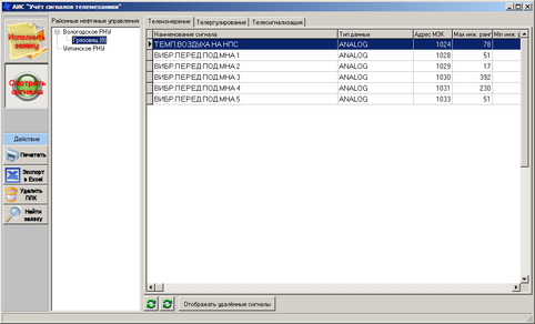 Пользователь выбирает название РНУ, затем номер ПЛК, ему принадлежащего и в конечном итоге процедуры FetchtTITRSignalsOnPLC и FetchtTUTSSignalsOnPLC возвращают данные по характеристикам затребованных сигналов. В выходной форме сигналы делятся на 4 группы по типу, каждая группа располагается на отдельном листе. Эти хранимые процедуры обеспечивают выборку каждой группы сигналов по отдельности. Таким образом, клиентскому приложению нет необходимости разделять сигналы самостоятельно. Кроме того на каждом листе сигналы сортируются по полю «Адрес МЭК» в возрастающем порядке. Такая форма наиболее удобна для телемехаников.