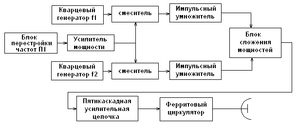 Тракт зондирующего импульса рис 3.2 предназначен для формирования высокочастотных зондирующих импульсов из маломощного непрерывного сигнала. Непрерывный сигнал с кварцевого генератора блока перестройки частот П1 усиливается усилителем мощности (в блоке П1 задается частота fзад). В смесителях происходит сложение несущей частоты f1 в первом канале и f2 во втором канале с частотой fзад. Затем образованные частоты складываются в блоке сложения мощностей для последующего усиления в пятикаскадной усилительной цепочке. Ферритовый циркулятор служит для переключения РЛУ с приема на передачу и обратно.