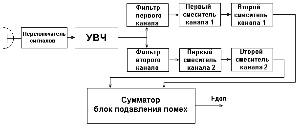 fпч = fпр ± Fd1, соответственно во втором канале fпч = fпр ± Fd2, где Fd1 и Fd2 – доплеровские добавки, а fпр – первоначальная частота, задающаяся гетеродинами 1 и 2 каналов.