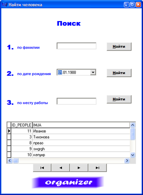 Функции удаления, добавления и редактирования реализованы точно так же как и в форме управления планировщиком задач, за исключением того, что в запросах используется таблица TBL_PEOPLE и ее соответствующие поля.