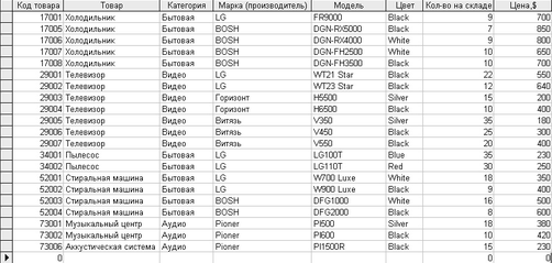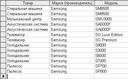 В нашем случае для описания предметной области необходимо три таблицы. Условно назовем их "Группа товаров", "Товары" и "Производитель". В каждой из них хранятся соответствующие атрибуты.