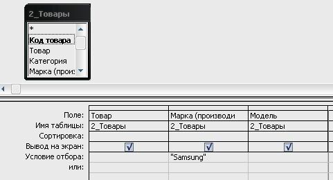 Для этого в режиме “конструктор” необходимо создать запрос на удаление и в строке “условие отбора” поля “марка (производитель) ” внести запись ”Samsung". Запрос в режиме “конструктор” будет иметь вид, представленный на рисунке 2.2.5.1.