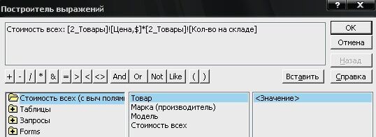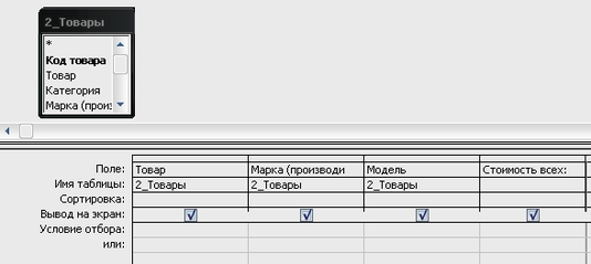 Отобразить товар, марку, модель, а также новое поле "стоимость всех". Для этого в режиме “конструктор” создадим соответствующий запрос.
