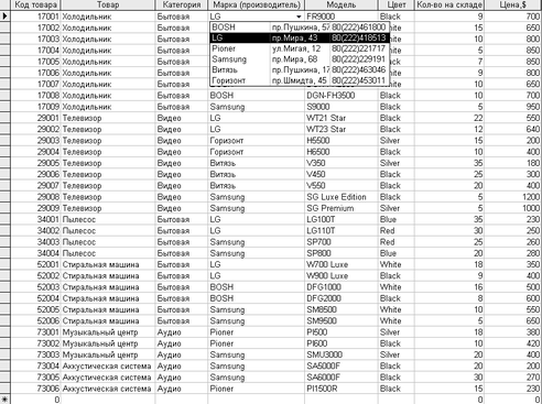 В таблице "1_Группа товаров" ключевым будет являться поле "категория техники". Оно же имеет свойство "Совпадения не допускаются". Для поля "Марка (производитель)" таблицы "2_Товары", значения выбираются из списка. Источник списка создается при помощи мастера подстановок.