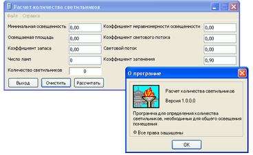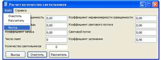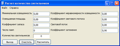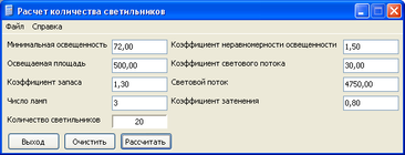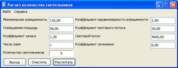 Итогом работы можно считать созданную программу для вычисления количества светильников, необходимых для общего освещения помещения. Данная программная реализация может служить органической частью решения более сложных задач.