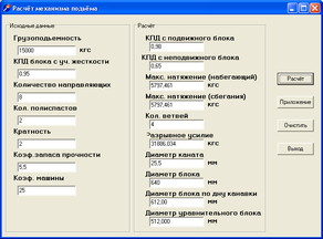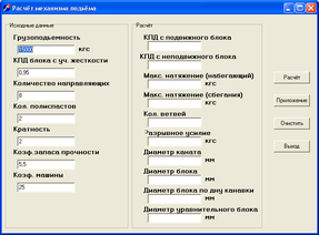 Данная программа предназначена для расчета диаметра каната, диаметра блока и барабана, а так же диаметра уравнительного блока.