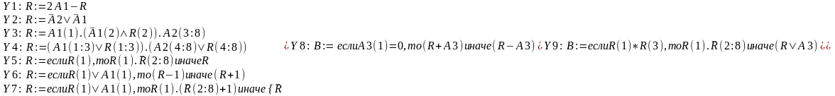 К подмножеству Y2 отнесем такие МО, в результате выполнения которых не происходит изменение содержимого регистра, но осуществляется передача в некоторую совокупность выходных шин кодов, которые зависят, в общем случае, и от содержимого регистра Рг, и от кодов на входных шинах. Эти МО описываются оператором присваивания вида:
