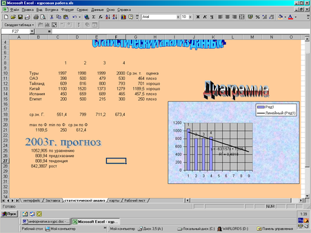 В ячейках C10:F15 вводятся цены на услуги. В ячейке G10 вводим формулу =СРЗНАЧ(C10:F15) и рассчитываем среднее значение по туру. В ячейке H10 вводим, =ЕСЛИ(F5>$D$13;"Хорошо";"Плохо"), при разных значениях в ячейках стоимости туров, т.е. при разных условиях (G11>$D$21 или G11<$D$21), будет загораться "Хорошо";"Плохо". Предварительно необходимо рассчитать max, min и среднее значения (G11:G15). Затем рассчитывается среднее значение по годам (=СРЗНАЧ(C11:C15); (D11:D15); (E11:E15); (F11:F15)). И, в итоге, делается прогнозирование (=ТЕНДЕНЦИЯ(C18:F18;C8:F8;7)).