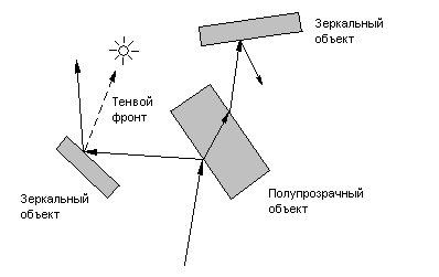 Алгоритм трассировки позволяет рисовать очень качественные тени. Это не потребует большой переделки алгоритма. В него придется кое-что добавить. При расчете освещенности точки необходимо пустить в каждый из источников света "Теневой фронт". "Теневой фронт" - это луч, с помощью которого проверяется, лежит ли что-нибудь между точкой и источником. Если между ними лежит непрозрачный объект, то точка находится в тени. Это значит, что данный источник, не делает свой вклад в итоговую освещенность точки. Если лежит прозрачный объект, то интенсивность источника уменьшается. Прорисовка теней является очень затратной по времени. Так что, в некоторых ситуациях их отключают.