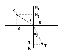 Обозначим преломленный луч, имеющий единичную длину, через T1. Единичный вектор нормали - через N1. А вектор, направленный противоположно падающему лучу - через S1. Разложим вектор S1 на A и Ns, а вектор T1 на B и NT. Вектор равен