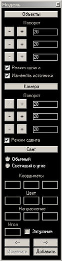 ля переноса вдоль какой-либо оси необходимо ввести в соответствующую ячейку величину, на которую нужно сдвинуть и нажать опять же на одну из кнопок. При нажатии на "+", сдвиг осуществится на введенное значение, а при нажатии на "-", на величину, противоположную введенной. Для того чтобы все преобразования производились и над источниками света нужно поставить галочку в поле "Изменять источники света".Камера.