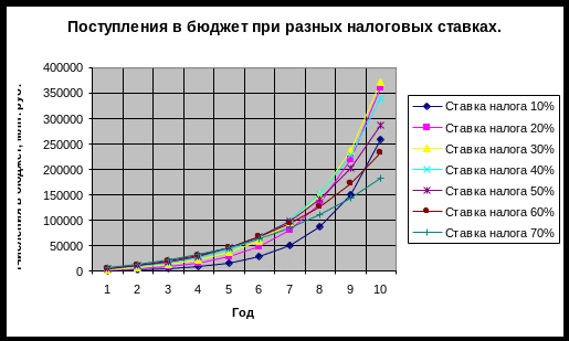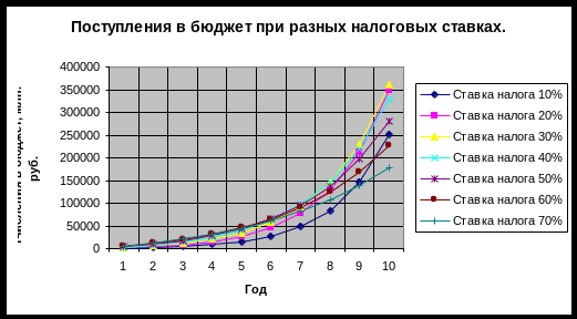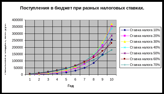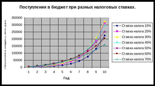 Вывод: За период 10 лет с начальным капиталом 9010 млн. руб. наибольшие отчисления в бюджет составляют 325744 млн. руб. при налоговой ставке 30%.