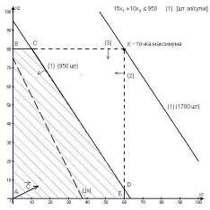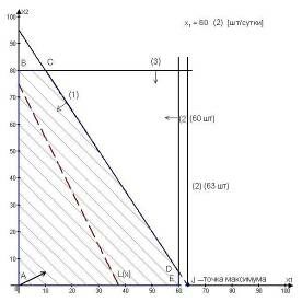 Аналогично видим, что производительность первой технологической линии - это правая часть связывающего ограничения (2) (60 шт/сутки). Согласно этому ограничению в точке D данная линия производит 60 радиоприемников первой модели в сутки.