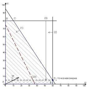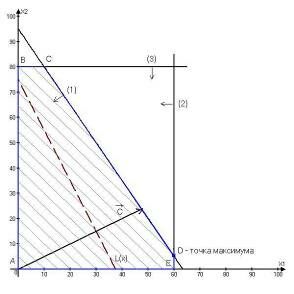 из точки (0;0) в точку (40;20). Точка D – это последняя вершина многоугольника допустимых решений ABCDE, через которую проходит целевая прямая, двигаясь по направлению вектора