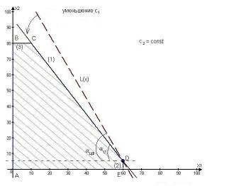 Наличие альтернативных оптимумов свидетельствует о том, что одно и то же оптимальное значение может достигаться при различных значениях переменных. Если целевая прямая выйдет за пределы наклона (1), то оптимальной точкой станет точка C. Допустим, что цена на радиоприемники второй модели не меняется, т.е. зафиксируем значение целевого коэффициента