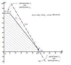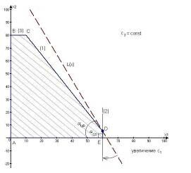 Изменение цен на продукцию, т.е. изменение коэффициентов ЦФ, представляется на графике вращением целевой прямой вокруг оптимальной точки. Так, при увеличении коэффициента ЦФ