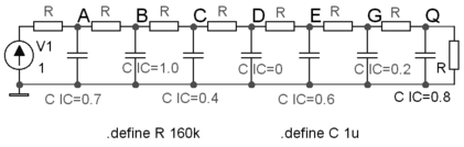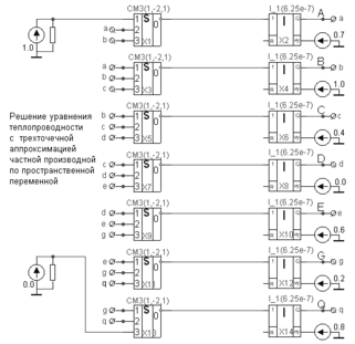 Соединив такие ячейки (аналоги дифференциальных уравнений системы) в последовательную электрическую цепь, мы получаем аналоговую модель дифференциального уравнения теплопроводности, которая изображена на рисунке 3.