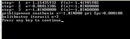 printf("pribligennoe znathenie x=%lf pri Eps=%lf\nkolithestvo iterasii n=%i\n",xn,eps,n);