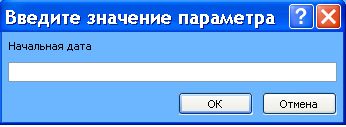 При запуску запиту з’являється діалогове вікно з пропонуванням ввести почпткову дату, а після вводу з’являється такий самий діалог для кінцевої дати (мал.18).