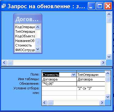 Введемо в рядок Оновлення вираз, що визначає нове значення поля «*0,05», і заповнимо рядок Умова відбору: 2 or 3 (мал.17).