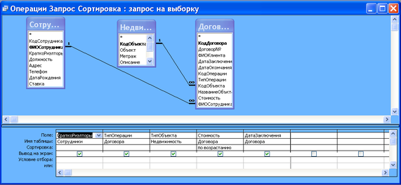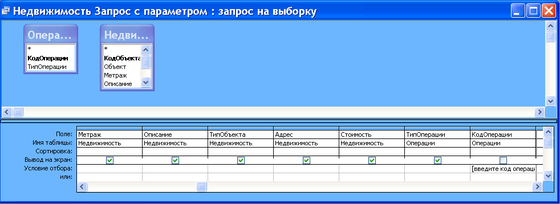- У режимі конструктора запиту переміщаю за допомогою миші поля з таблиці «Недвижимость» : КодОбъекта, Объект, Метраж, Описание, ТипОбъекта, Адрес, Стоимость. З таблиці «Операции»: ТипОперации і Код Операции (мал.10).