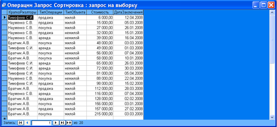 В своїй БД, я створила Запит із Сортуванням за «Операциями» . Для цього спочатку виконила всі дії як в попередньому пункті, потім в бланку запиту в полі Сортування для стовпця Стоимость вибрала За збільшенням (мал.8). Результат на мал.9.