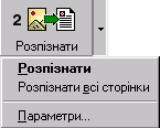 | 2-розпізнати | Розпізнати - розпізнає відкриту сторінку пакета Розпізнати всі сторінки - розпізнає всі нерозпізнані сторінки пакета Параметри - відкриває закладку Розпізнавання діалогового вікна Параметри, на якій можна задати параметри розпізнавання документу |