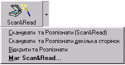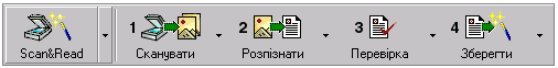 Кнопки на головній панелі програми Scan&Read ( мал. 4 ) пов'язані з базовими операціями системи: Сканування, Розпізнавання, Перевірка і Збереження результатів розпізнавання. Цифри на кнопках вказують, у якому порядку потрібно виконати дії, щоб одержати електронну версію паперового документу. Кожну з цих дій можна провести окремо чи об'єднати в одну, натиснувши на кнопку Scan&Read. Вона дозволяє провести повний цикл обробки тексту автоматично. Кожна з кнопок має кілька режимів роботи. Натиснувши на стрілку праворуч від кнопки, у локальному меню, яке відкрилося, можна вибрати один з них, при цьому "інформація" про це відіб'ється на іконці кнопки. Для того, щоб повторити ту ж операцію для іншого зображення, досить повторно натиснути на кнопку.