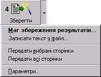 | Маг збереження результатів - відкриває діалогове вікно Маг збереження результатів, у якому можна вибрати програму для збереження і задати параметри збереження Записати текст у файл - записує розпізнаний текст у файл на диск Передати сторінки в - прямо передає розпізнаний текст до обраної програми без збереження його на диск. При передачі розпізнаного тексту з декількох сторінок пакету спочатку потрібно виділити їх у вікні Пакет. Передати всі сторінки в - передає всі розпізнані сторінки до обраної програми без збереження їх на диск Параметри - відкриває закладку Оформлення діалогового вікна Параметри, на якій можна задати параметри збереження документу |