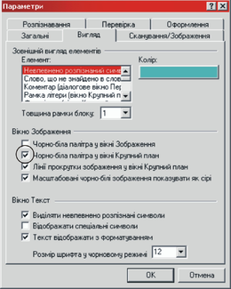 Увесь простір Головного вікна займають, по мірі того як вони з'являються, робочі вікна системи: Пакет, Зображення, Крупний план та Текст. Стандартний режим відображення у вікні Крупний план - чорно-біле зображення, незалежно від того яке саме зображення (кольорове, сіре чи чорно-біле) було відправлене на сканування. Якщо робота здійснюється з кольоровим зображенням і необхідно, щоб у вікні Крупний план зображення відображалось також у кольоровому режимі, то слід зняти позначку вибору з пункту Чорно-біла палітра у вікні Крупний план, що у групі Вікно Зображення, яка на закладці Вигляд (меню Сервіс>Параметри) ( Мал. 3 ).