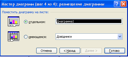 У даному вікні вибираємо один з двох варіантів розміщення діаграми – на окремому аркуші діаграм чи на будь-якому з аркушів робочої книги і отримуємо побудовану діаграму (рис. 3.4).