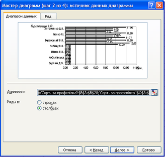 На цьому етапі визначаємо джерело даних (діапазон), якщо воно не було визначене раніше, та, за необхідності, видаляємо, додаємо ряди даних чи встановлюємо їх параметри. Параметри Имя та Подписи по оси Х можемо визначити як посилання на клітинки чи діапазони або текстовими константами (рис. 3.2);