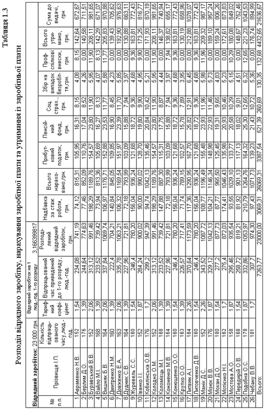Зарплата робітника дорівнює різниці «Всього нараховано» та «Всього утримано» =H4-N4 (табл. 1.3).