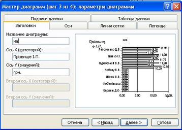 - Заголовки – вводимо назву діаграми, підписи осі категорій, рядів та осі значень;