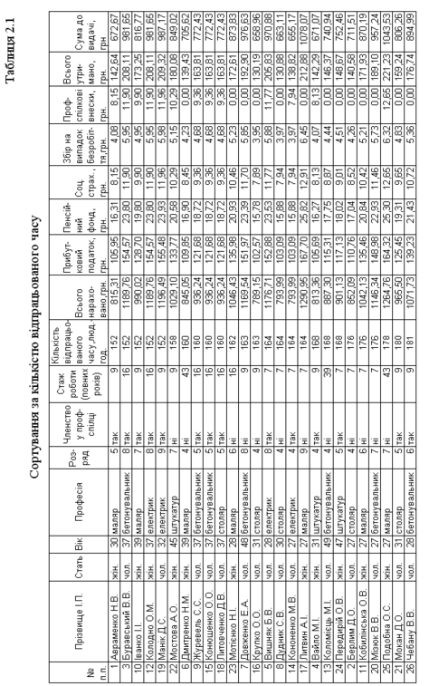Поле «Кількість відпрацьованого часу» складається з текстових (символьних) даних. Їх впорядковують за їх кодами в таблиці символів в алфавіті відповідної мови (табл. 2.1).