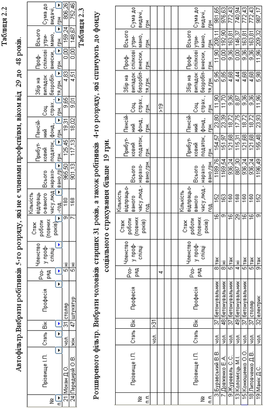 За допомогою фільтра в Excel можна вибирати значення, які відповідають заданим умовам, серед інформації, що збігаються у таблицях (табл. 2.3).