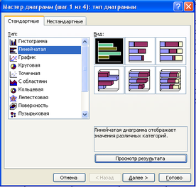 Вибираємо з вкладок, в яких наведено перелік різноманітних стандартних і нестандартних типів діаграм та графіків тип діаграми, який відповідає умовам задачі і максимально спрощує сприйняття й аналіз даних.