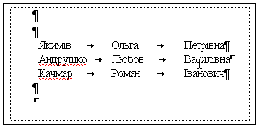 Для того, щоб перетворити текст у таблицю, спочатку потрібно виділити його. Після цього вибрати команду Перетворити в таблицю з меню Таблиця. У діалоговому вікні Перетворити в таблицю необхідно підтвердити свою згоду із запропонованим Word розміром таблиці (3 стовпці на 3 рядки), клацнувши на кнопці ОК. У результаті отримається таблиця, представлена на мал. 17.