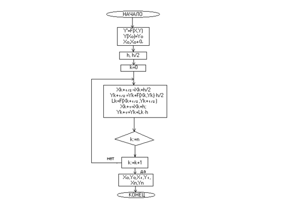 порядок похідної – у нашому випадку згідно з варіантом курсової – порядок 1 (диференціальне рівняння першого порядку). Далі визначаємо коефіцієнти та коефіцієнт при х. Вводимо границі відрізку . Фіксований приріст аргументу h = (xf -x0 )/n, де xf - кінцева точка інтервалу інтегрування , n – кількість кроків. Потім, використовуючи процедуру модифікованого методу Ейлера, , обчислюємо yk згідно з рекурсивною формулою: