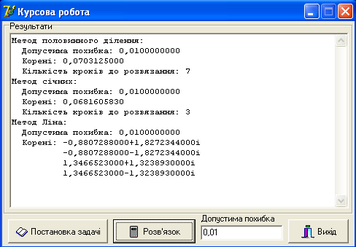 Розроблена програма дозволяє розв’язати вказане нелінійне рівняння методами половинного ділення та січних, порівняти результати їх роботи: