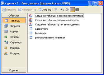 Також при створенні таблиці має сенс наперед продумати можливі впорядкування, які можуть знадобитися при роботі з даними, що містяться в ній. Завдання індексів з відповідними ключовими виразами може надалі істотно прискорити процес роботи (особливо з великими масивами даних). Після створення опису структури таблиці можна перейти в режим безпосереднього введення в неї даних. Як вже мовилося, важливою перевагою інтерфейсу СУБД Access є продумана гнучка система переходу від режиму Конструктора до режиму введення даних в таблицю (Режим таблиці). Такий перехід можна здійснити, клацнувши мишею по піктограмі Вигляд, розташованою на панелі інструментів, або вибравши функцію меню Вигляд - Режим таблиці. Очевидно, що ті дії, які були детально описані для таблиці, слід виконати і для решти інформаційних масивів. В результаті ми отримаємо систему таблиць бази даних. Підкреслимо, саме систему, так як дані, які знаходяться в ній тісно зв’язані між собою.