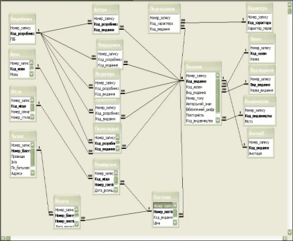 Використовуючи вище сказане для БД бібліотечного фонду проектується схема даних та встановлюються зв’язки між таблицями, які потрібні для подальшої роботи з створеною БД (Рис. 3.3).