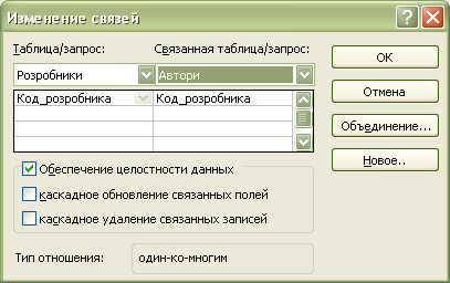 Тип відношення визначає тип відношення пов’язаних таблиць. Розрізняють два типи відношень: “один до одного” та “один до багатьох".